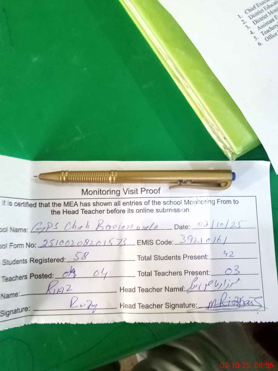 | Attendance Register | Head Teacher | MEA with School | Visit Proof |