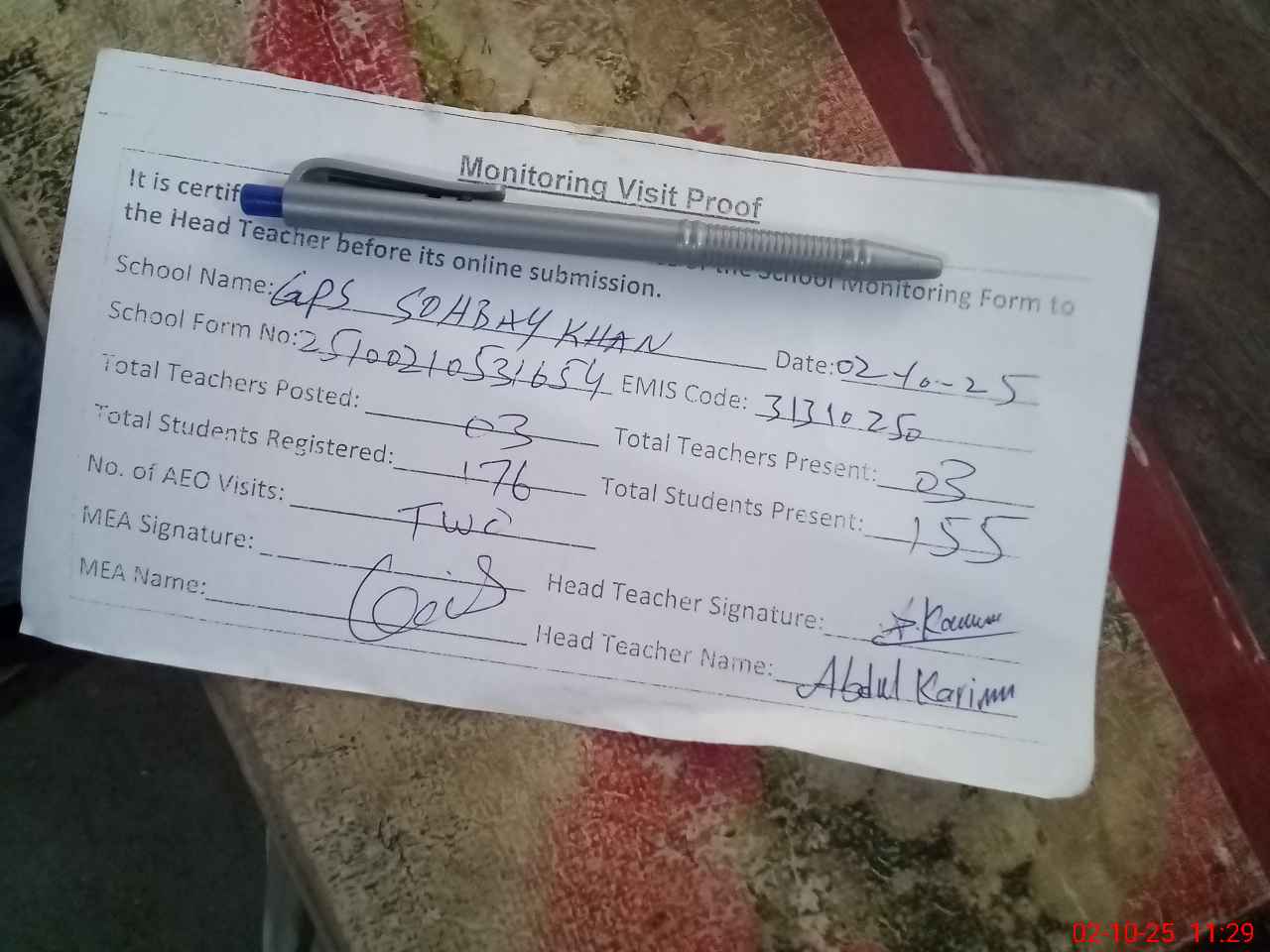 | Attendance Register | Head Teacher | MEA with School | Visit Proof |