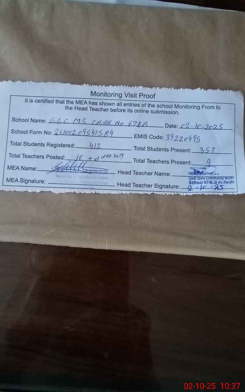 | EMIS Code: 39220495 | Name of School: GGCMS CHAK NO. 67/EB | |||