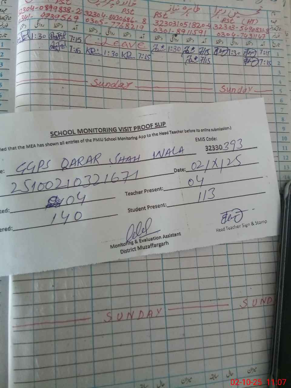 | Attendance Register | Head Teacher | MEA with School | Visit Proof |