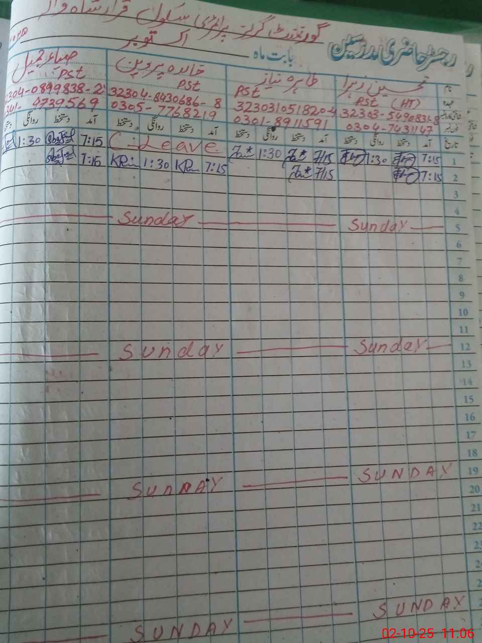 | CNIC | Full Name | Designation | R/C | Absence During Last Calender Month |