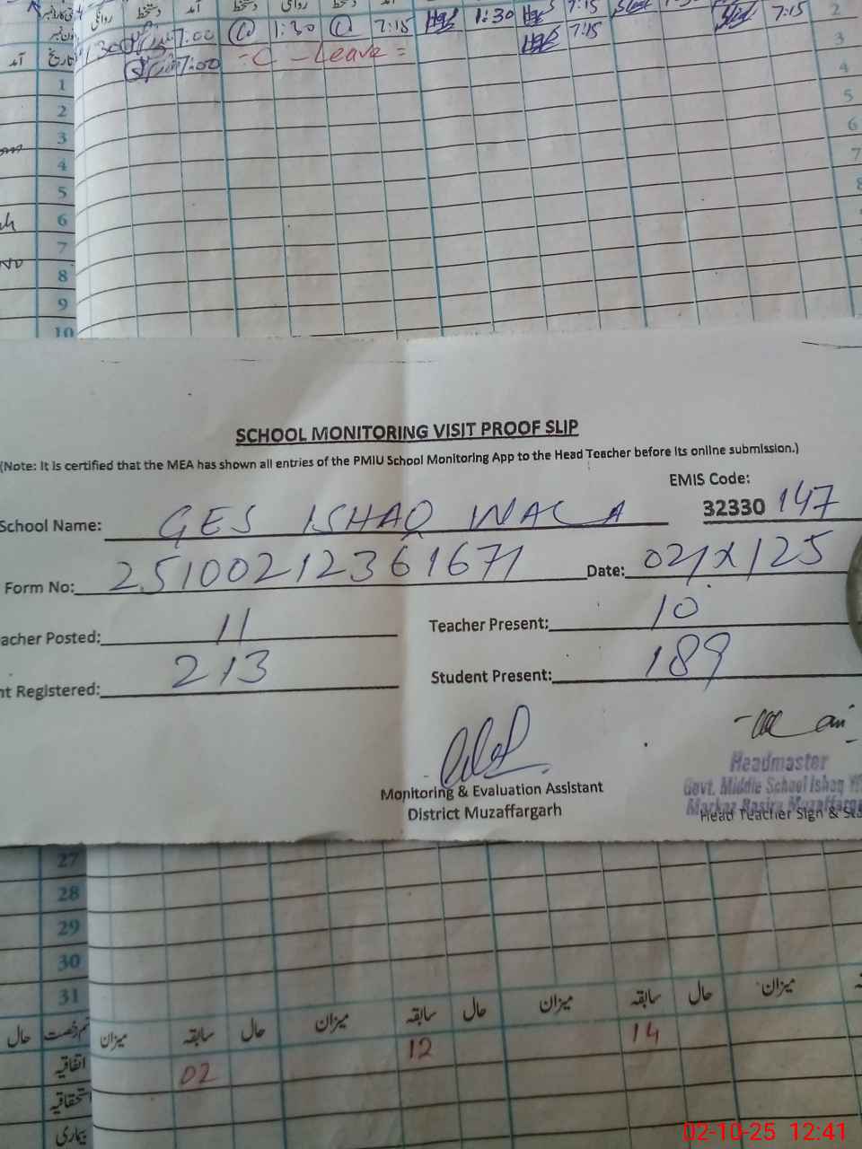 | Attendance Register | Head Teacher | MEA with School | Visit Proof |