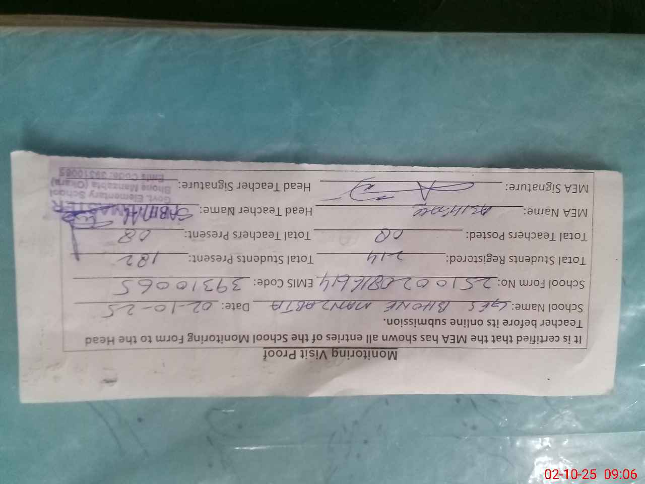 | Attendance Register | Head Teacher | MEA with School | Visit Proof |