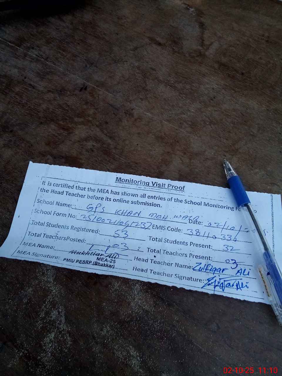 | EMIS Code: 38110330 | Name of School: GPS KHAN MUHAMMAD WALA | |||