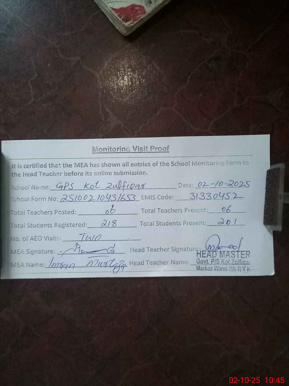 | Attendance Register | Head Teacher | MEA with School | Visit Proof |