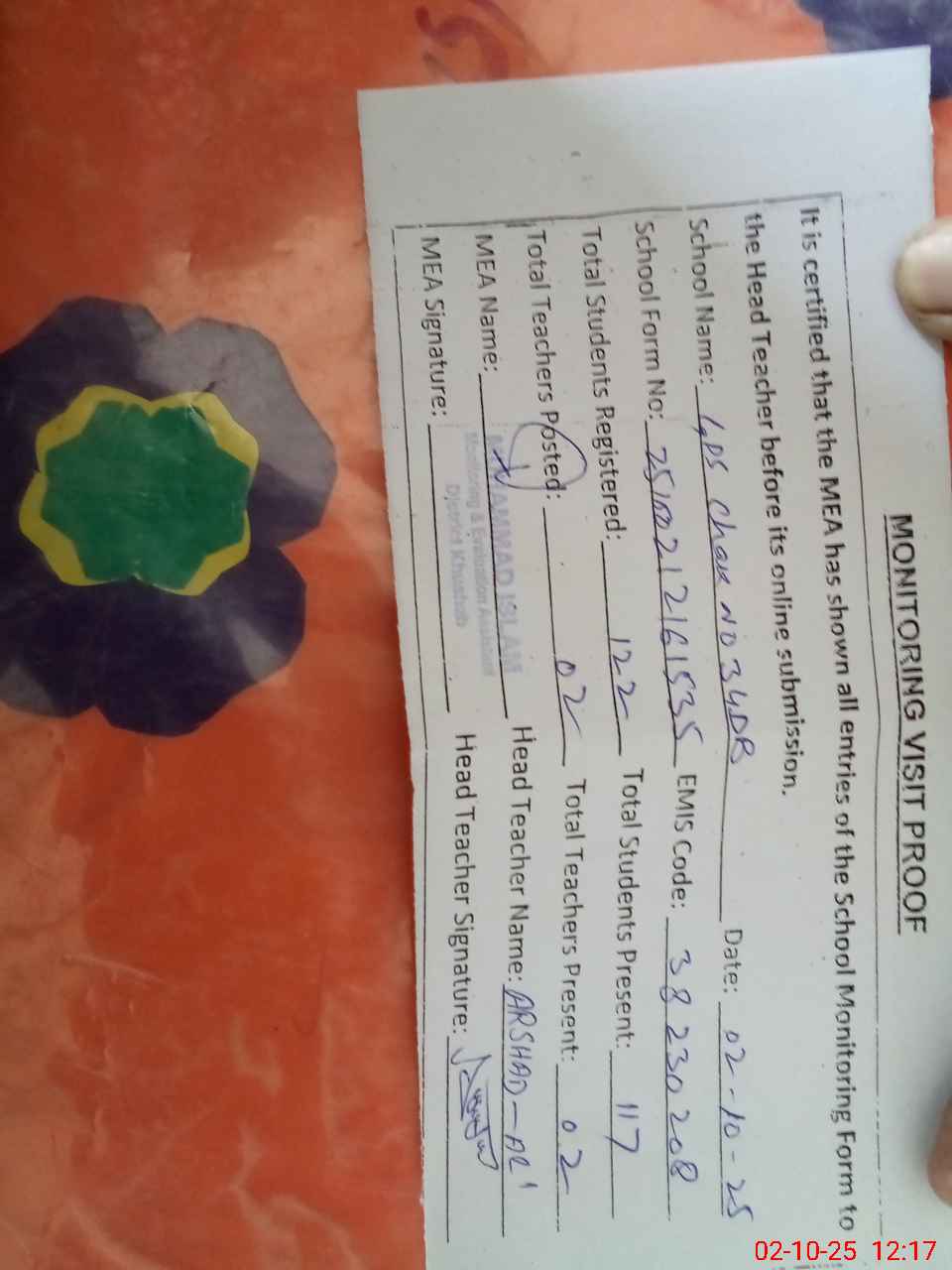 | Attendance Register | Head Teacher | MEA with School | Visit Proof |