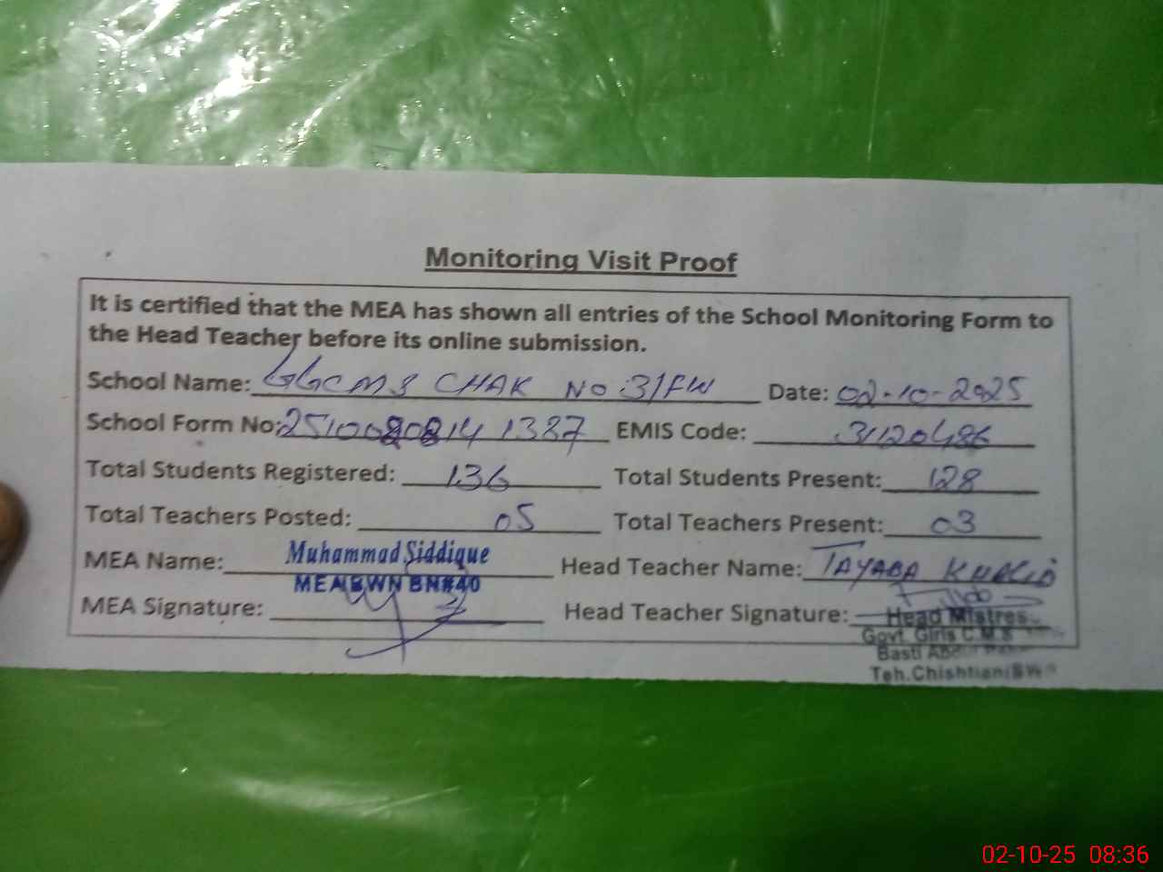 | Attendance Register | Head Teacher | MEA with School | Visit Proof |