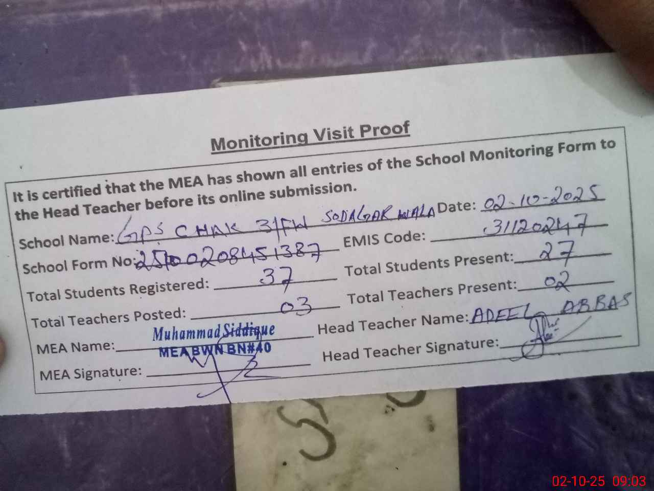 | Attendance Register | Head Teacher | MEA with School | Visit Proof |