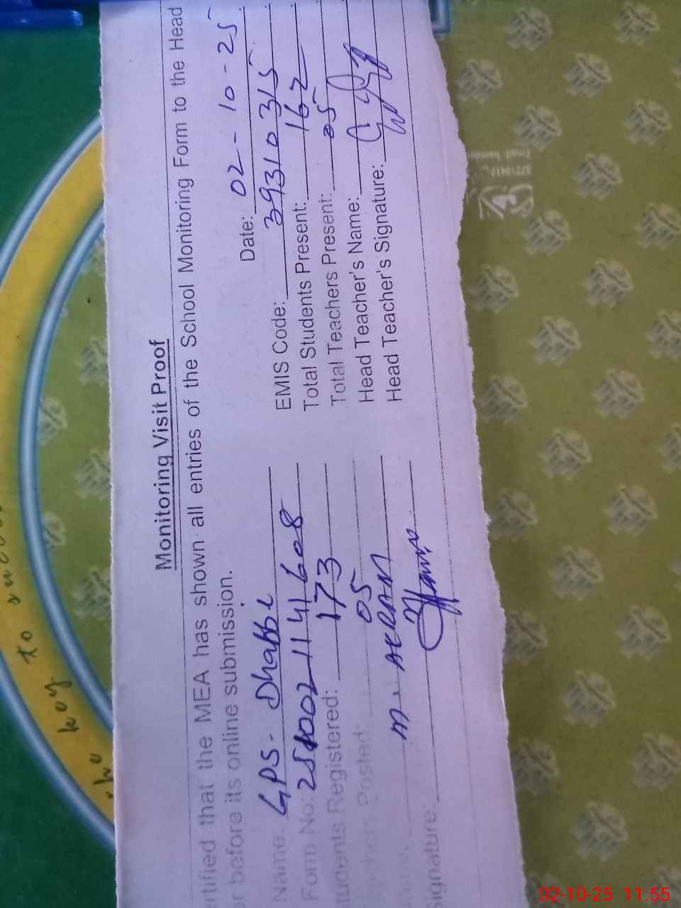 | Attendance Register | Head Teacher | MEA with School | Visit Proof |