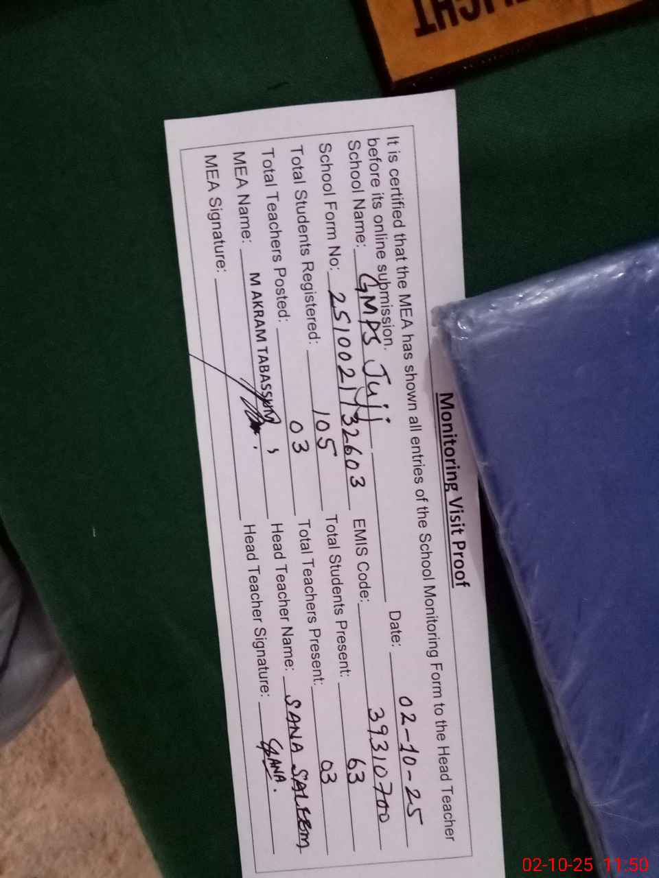 | Attendance Register | Head Teacher | MEA with School | Visit Proof |