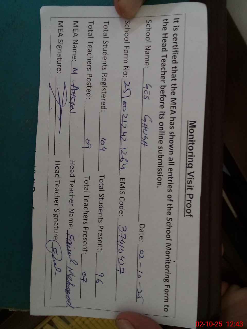| Attendance Register | Head Teacher | MEA with School | Visit Proof |
