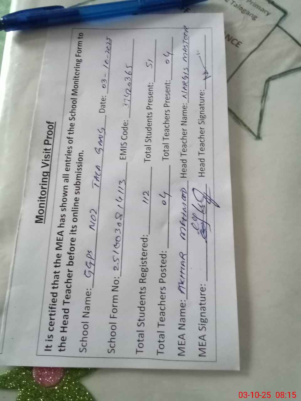 | Attendance Register | Head Teacher | MEA with School | Visit Proof |