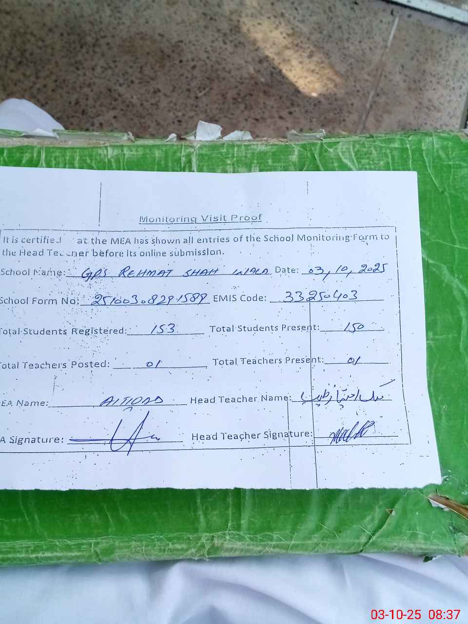 | Attendance Register | Head Teacher | MEA with School | Visit Proof |