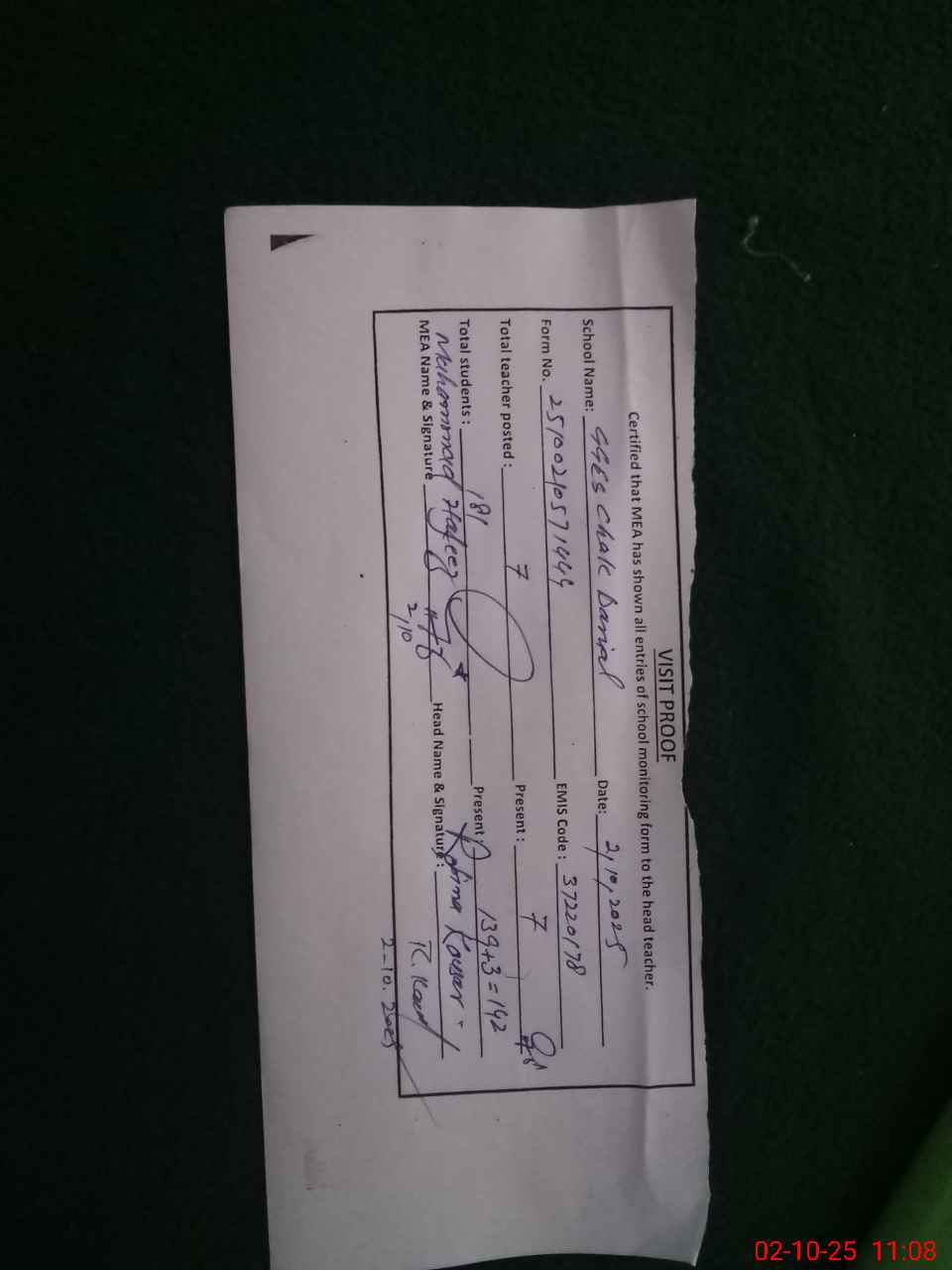 | Remarks (Use Separate Page if Required): Sir PST Teacher Salma Shaheen was posted in GGES Chakdanial from 8 February 2025 from GGPS kotal kund till to date 2 October 2025 Please update on MEA Tab | |||||