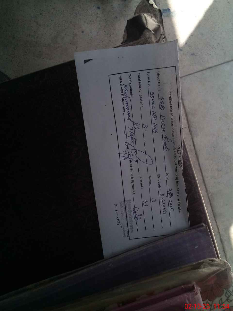 | Attendance Register | Head Teacher | MEA with School | Visit Proof |