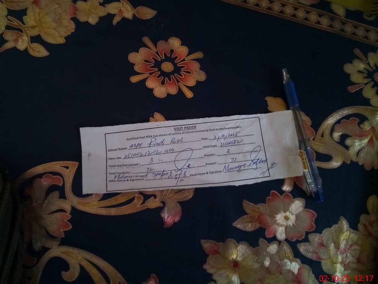 | Attendance Register | Head Teacher | MEA with School | Visit Proof |