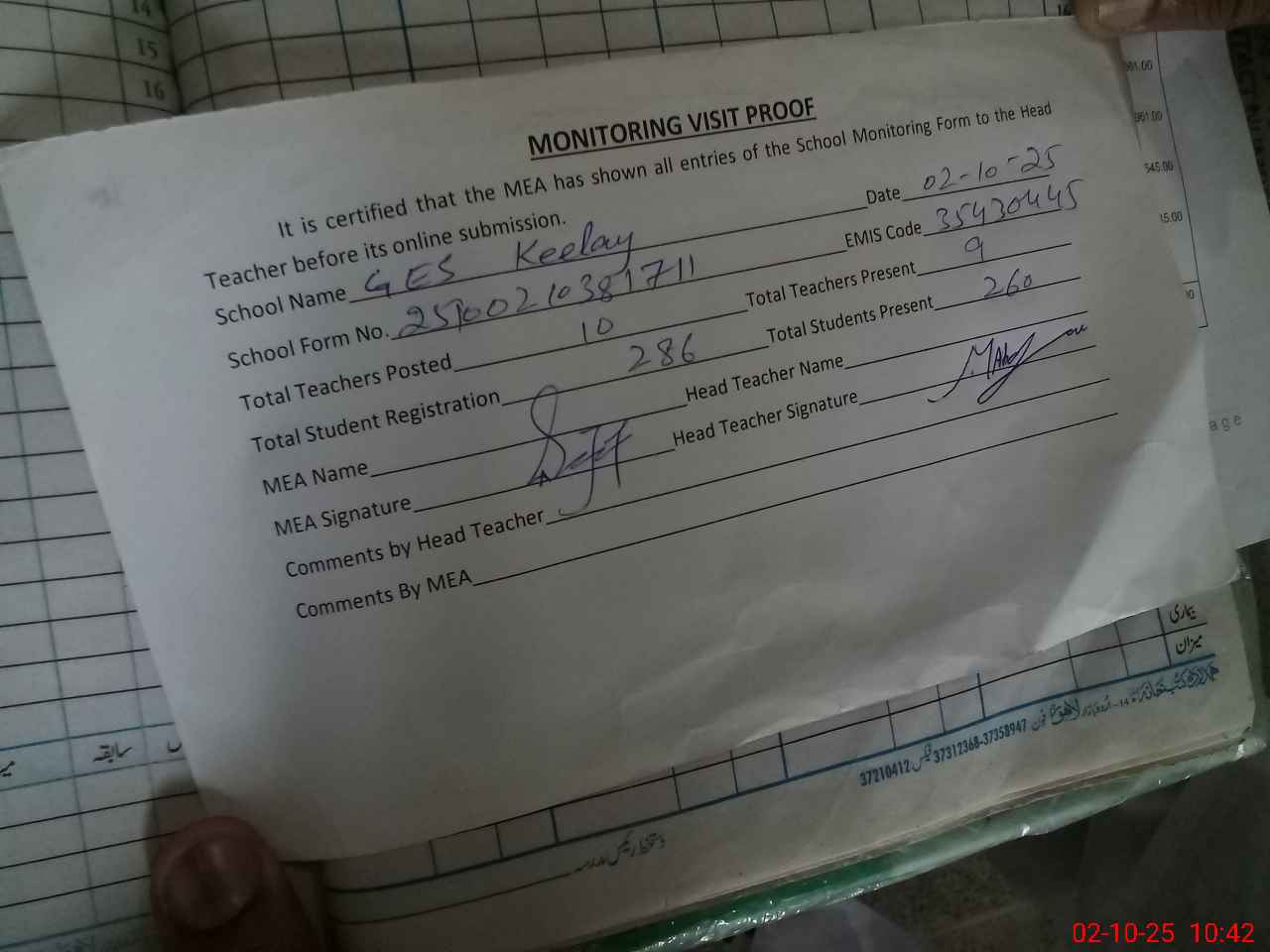 | Attendance Register | Head Teacher | MEA with School | Visit Proof |