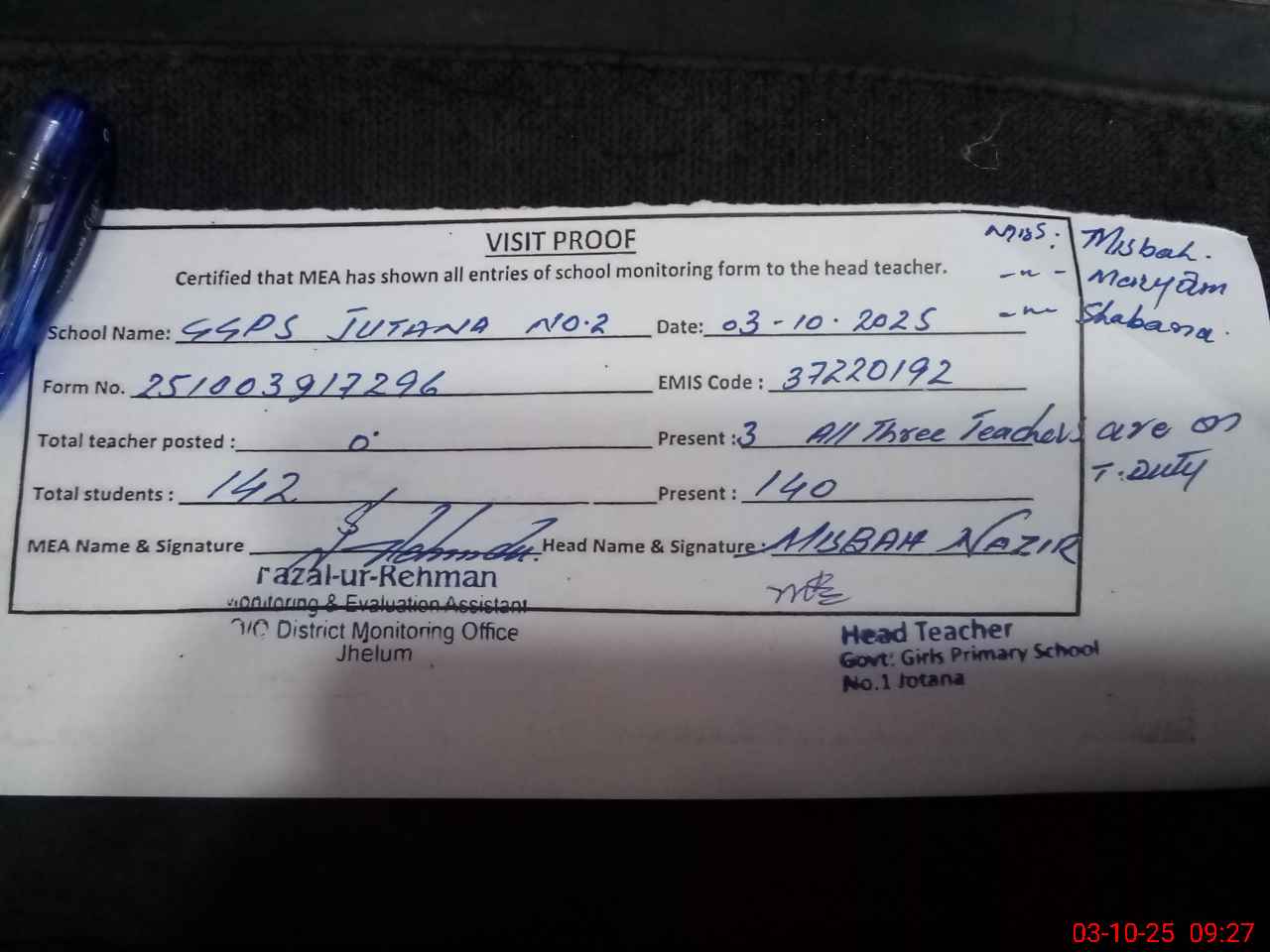 | Attendance Register | Head Teacher | MEA with School | Visit Proof |