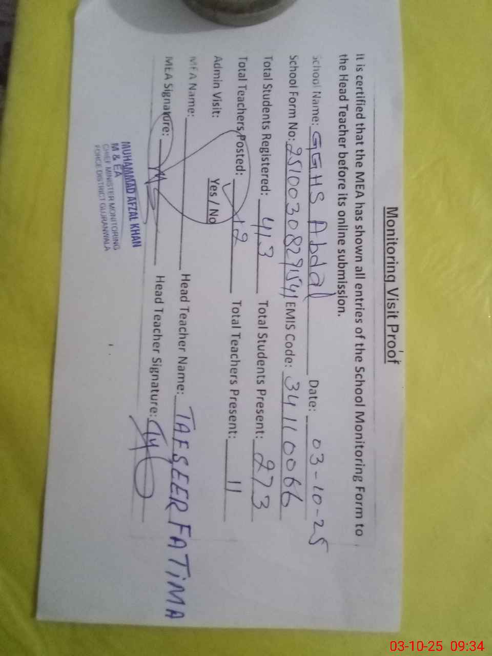 | EMIS Code: 34110066 | Name of School: GGHS ABDAL | |||