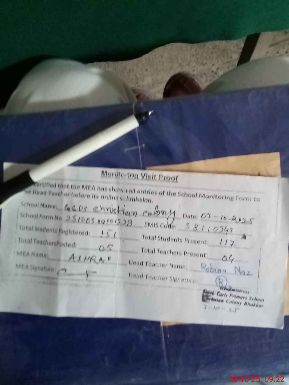 | Attendance Register | Head Teacher | MEA with School | Visit Proof |