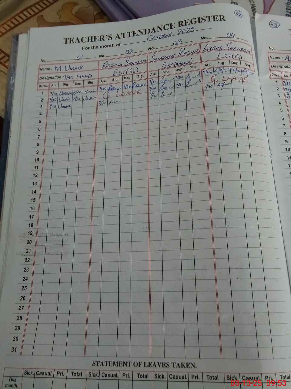 | Leave | Duty | Absent | Maternity | Medical | Ex- Pak |