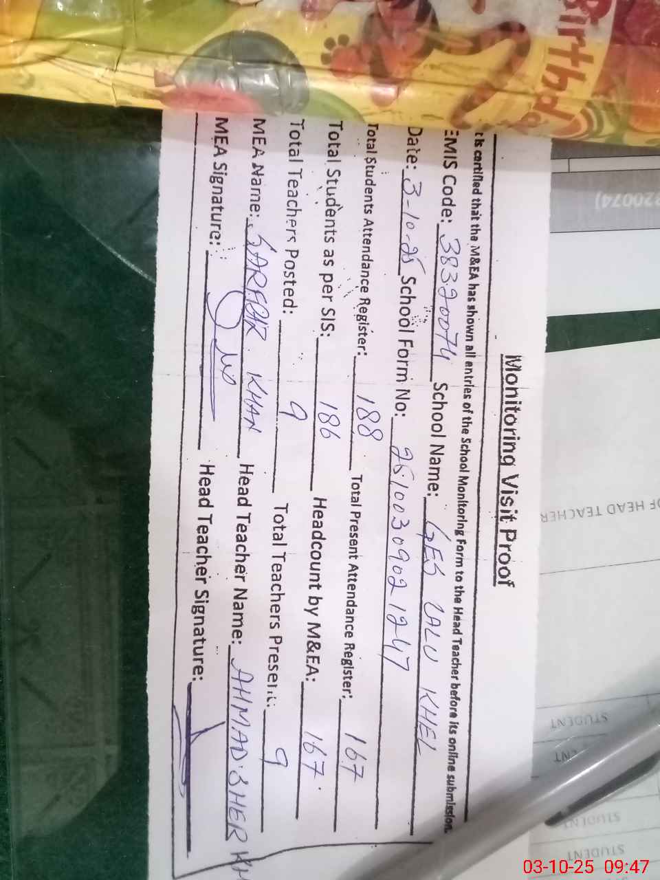 | Attendance Register | Head Teacher | MEA with School | Visit Proof |