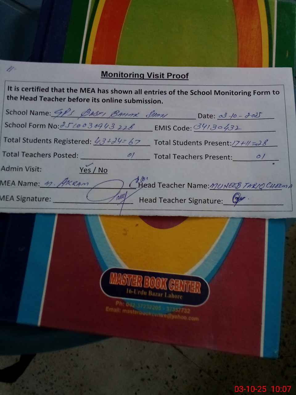 | EMIS Code: 34130432 | Name of School: GPS BASTI BAHAR SHAH | |||