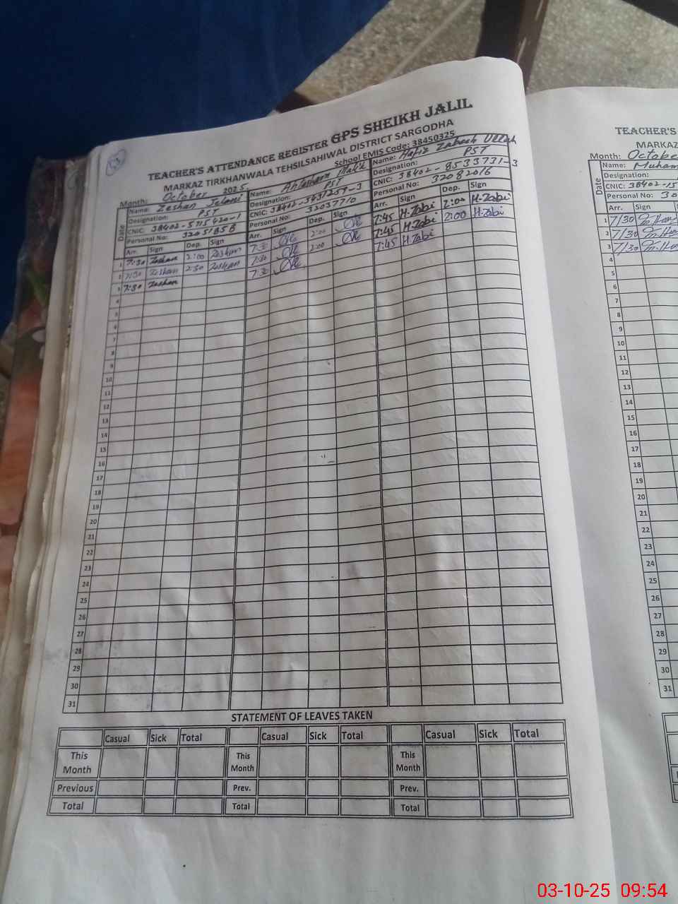 | CNIC | Full Name | Designation | R/C | Absence during last cal. month |