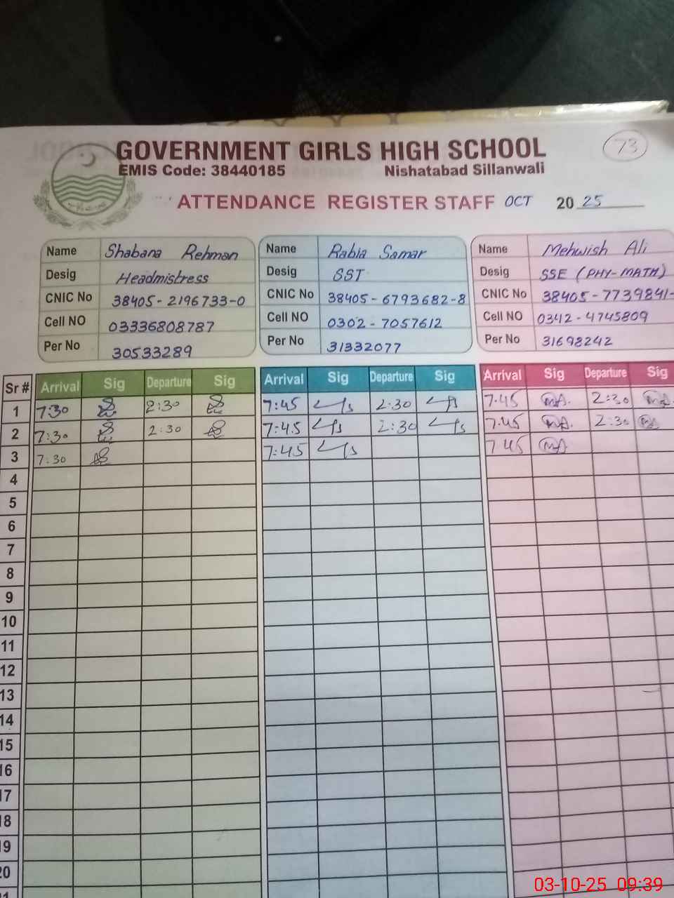 | Name: Sh**** Re**** Designation: (School Headmaster's/Headmistress's) SST (G) Phone/Cell Number: 03**** |