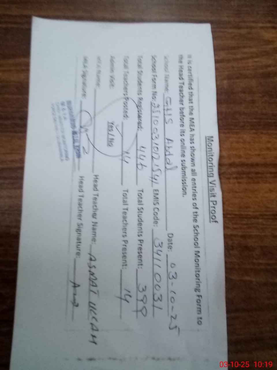 | EMIS Code: 34110031 | Name of School: GHS ABDAL | |||
