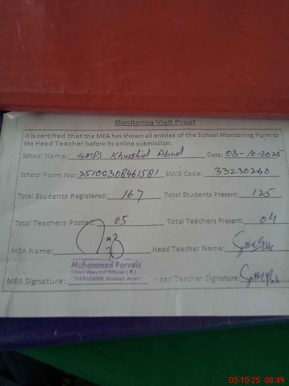 | Certified that this School was Inspected by the Undersigned MEA/DMO Today and the Information Stated Above is as Per Record. | |||||