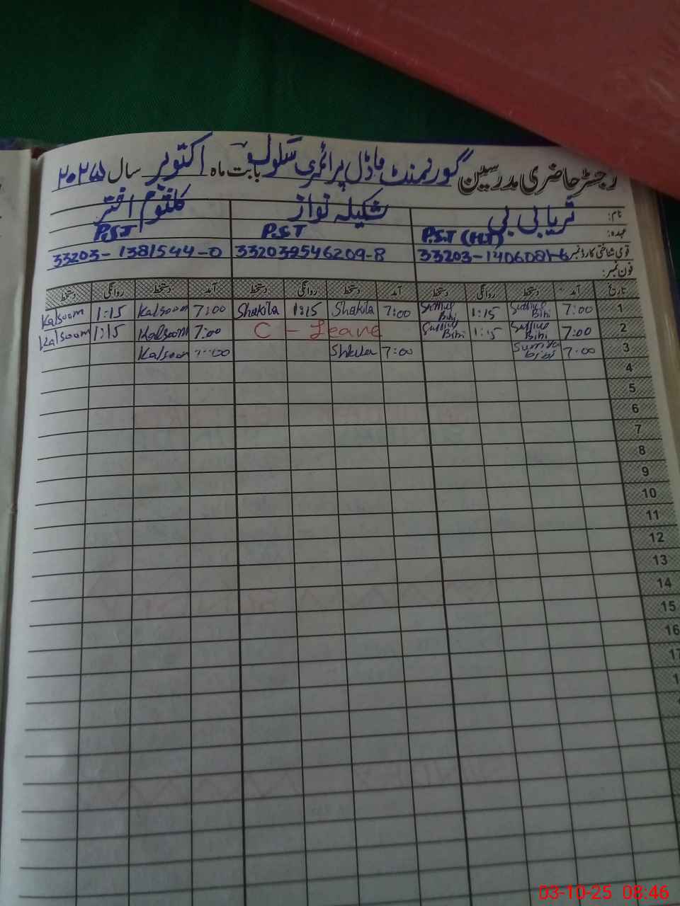| Name: SU**** BI**** Designation: (School Headmaster's/Headmistress's) PST Phone/Cell Number: 03**** |