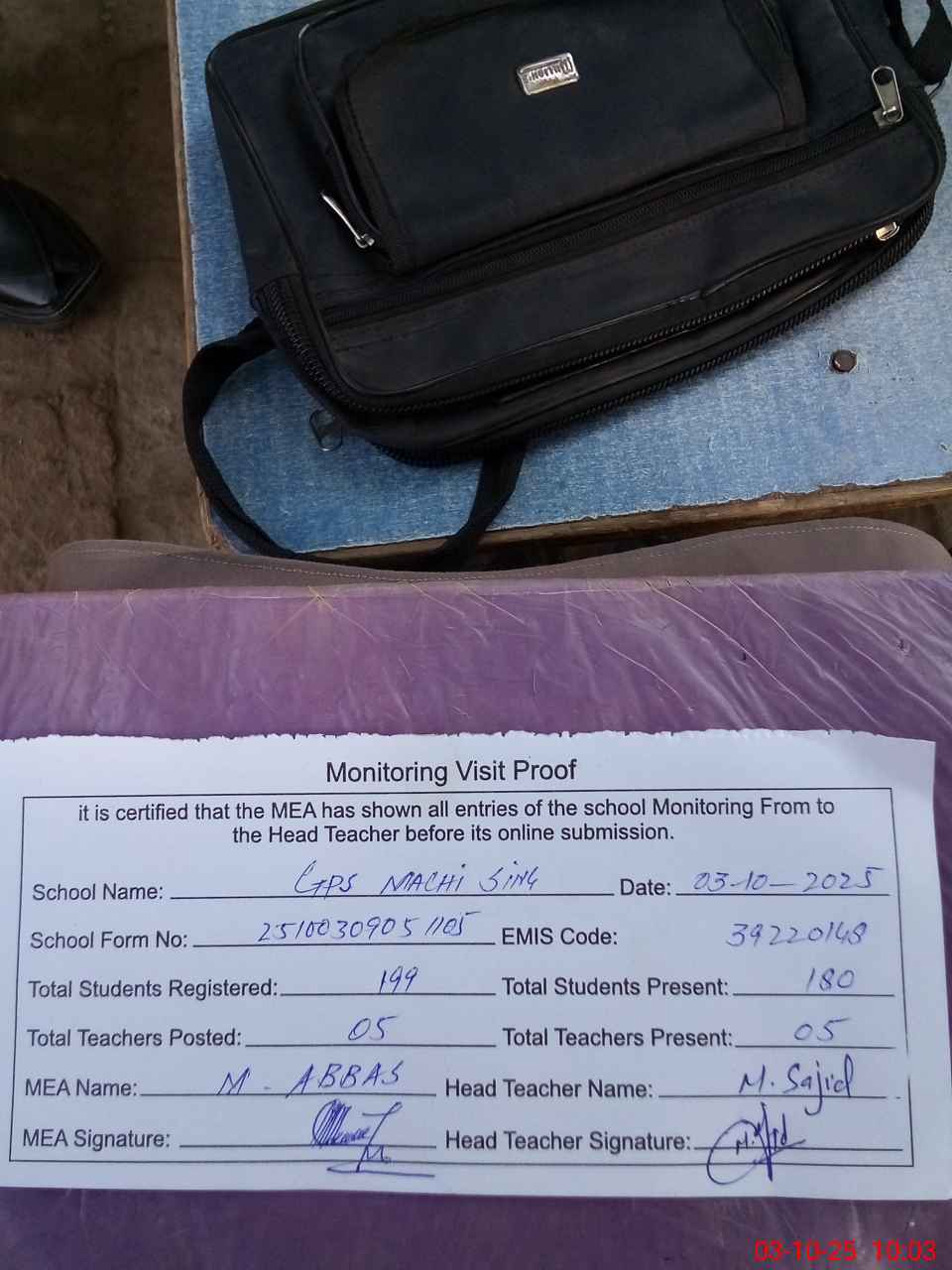 | Monitoring Date: 03-10-2025 | Start Time: 03-10-2025 09:05 AM | End Time: 03-10-2025 10:03 AM | Name of MEA: Mu**** Ab**** | |