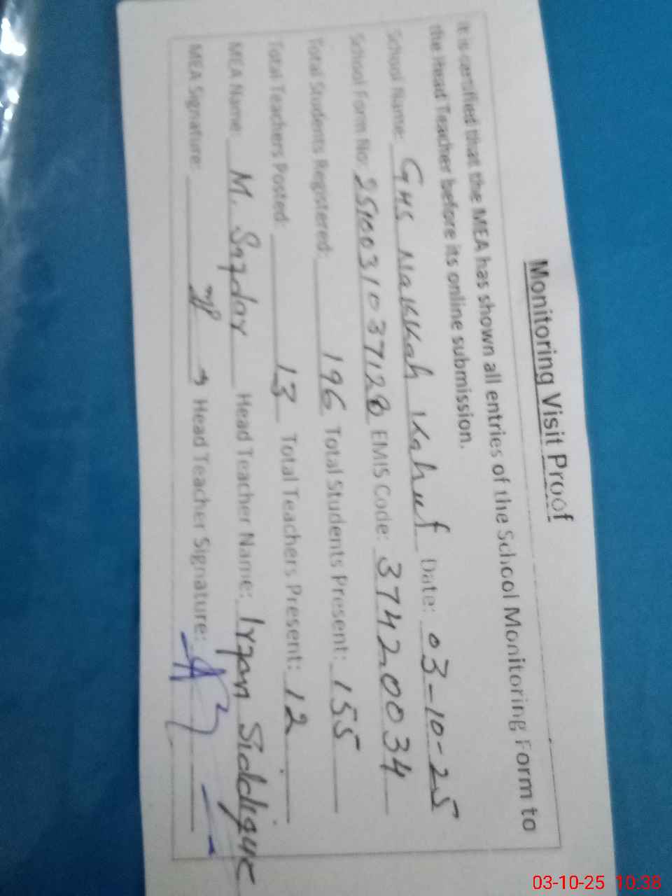 | Attendance Register | Head Teacher | MEA with School | Visit Proof |