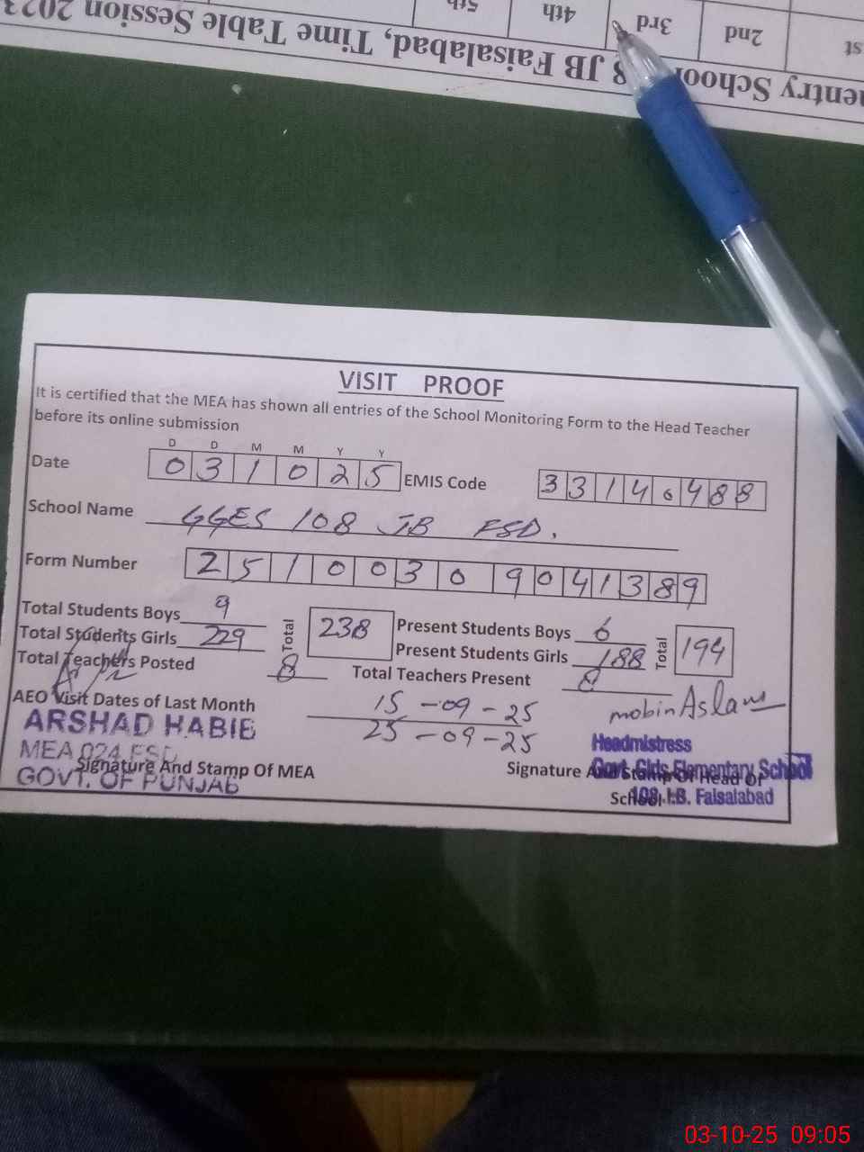 | Certified that this School was Inspected by the Undersigned MEA/DMO Today and the Information Stated Above is as Per Record. | |||||