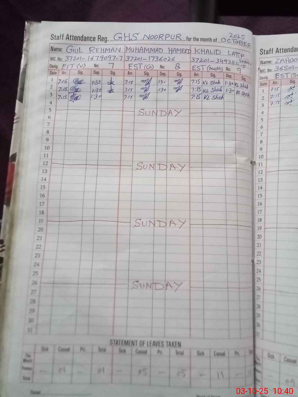 | CNIC | Full Name | Designation | R/C | Absence During Last Calender Month |