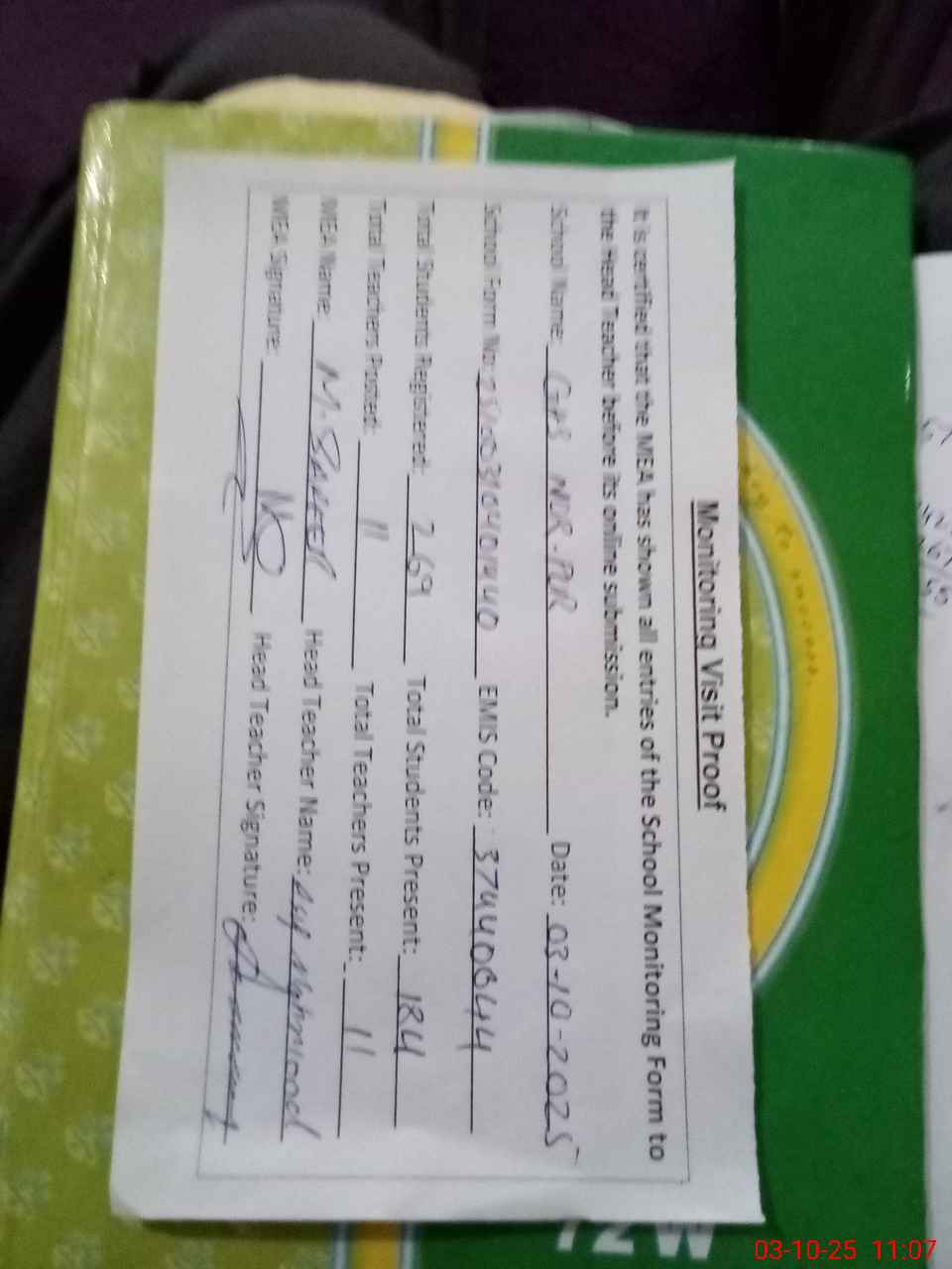 | Attendance Register | Head Teacher | MEA with School | Visit Proof |