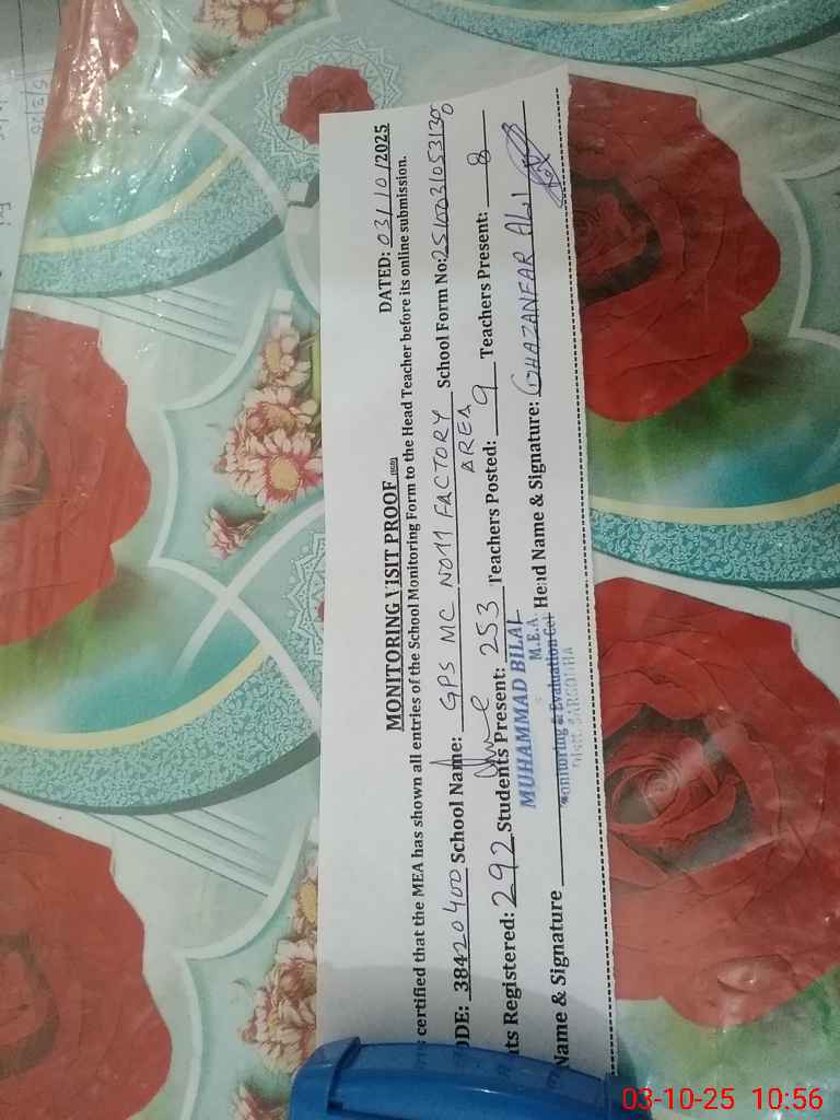 | EMIS Code: 38420400 | Name of School: GPS MC NO. 11 FACTORY AREA SARGODHA | |||