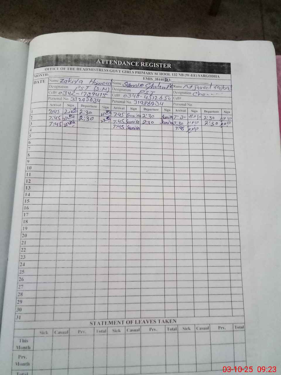 | Name: ZA**** HA**** Designation: (School Headmaster's/Headmistress's) PST Phone/Cell Number: 03**** |