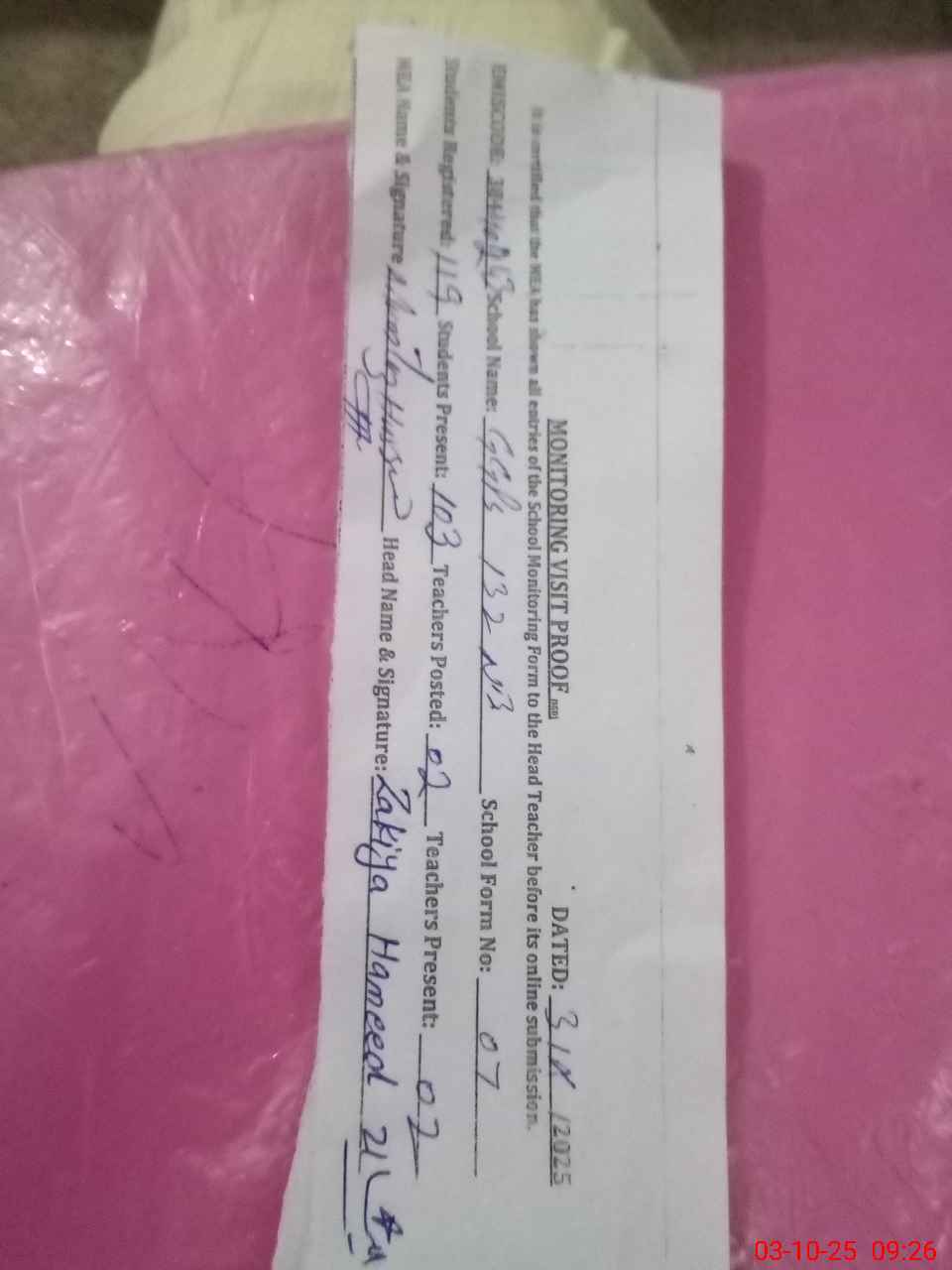 | Attendance Register | Head Teacher | MEA with School | Visit Proof |