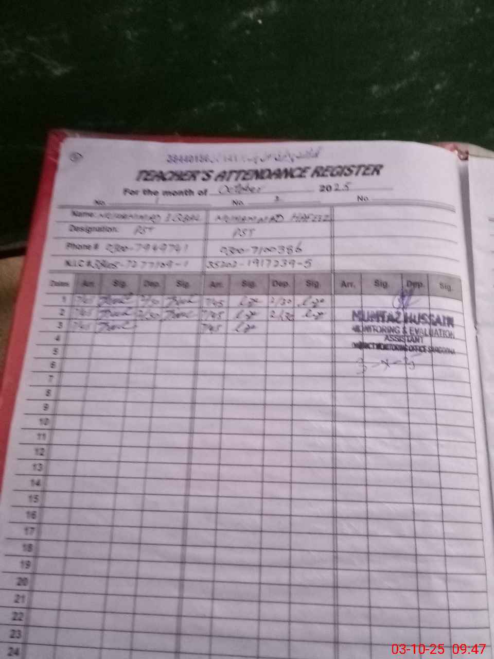 | Name: MU**** IQ**** Designation: (School Headmaster's/Headmistress's) PTC/JV Phone/Cell Number: 03**** |