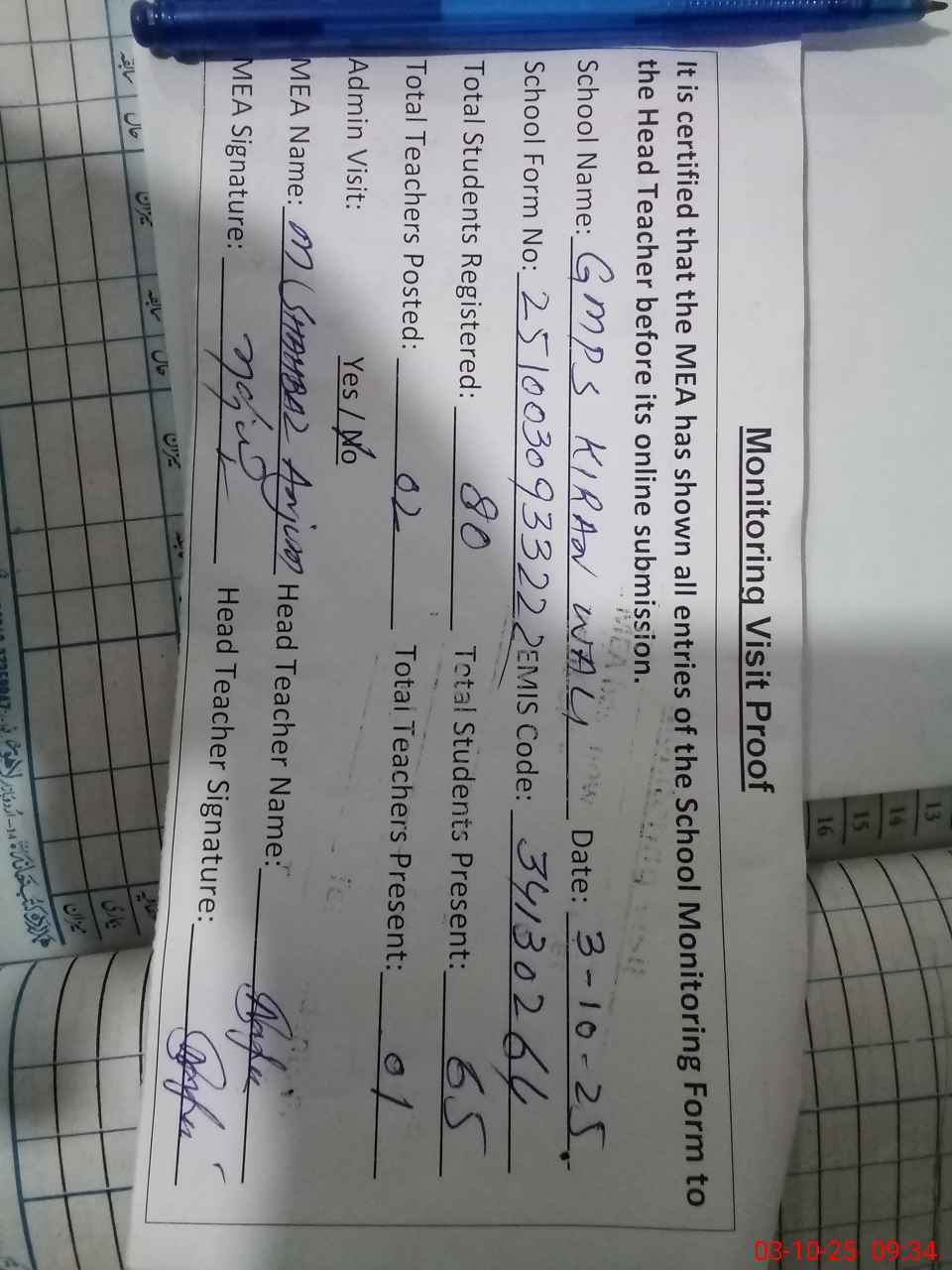 | EMIS Code: 34130264 | Name of School: GMPS KIRAN WALI | |||