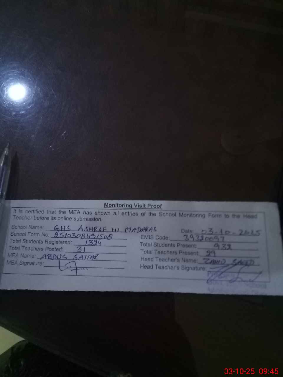 | EMIS Code: 39320097 | Name of School: GHS ASHRAF UL MADARAS | |||