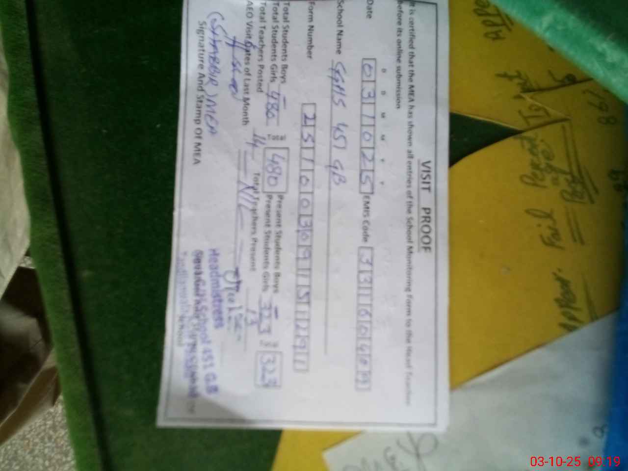 | Attendance Register | Head Teacher | MEA with School | Visit Proof |