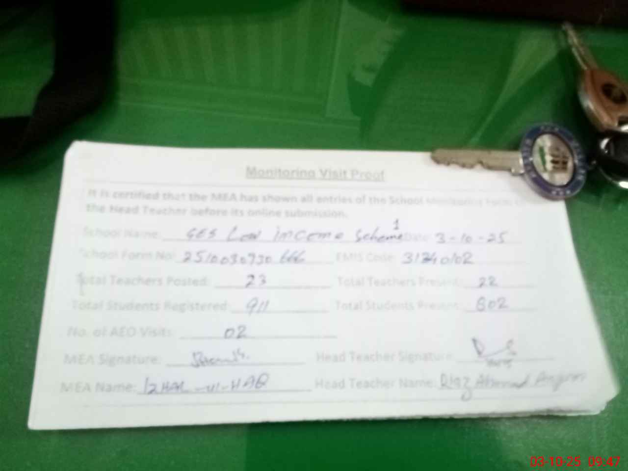 | Attendance Register | Head Teacher | MEA with School | Visit Proof |