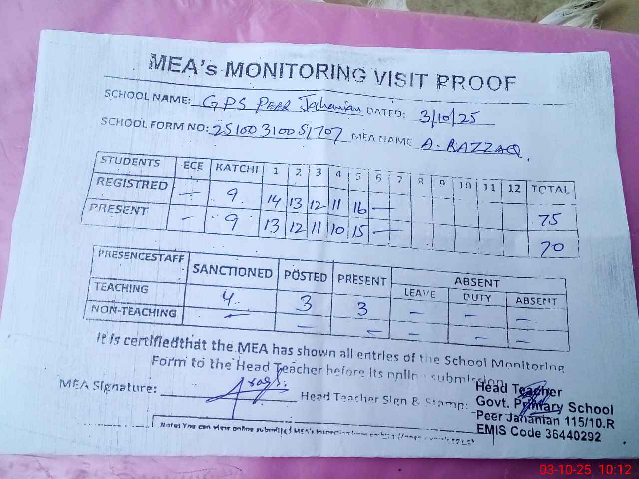 | Attendance Register | Head Teacher | MEA with School | Visit Proof |