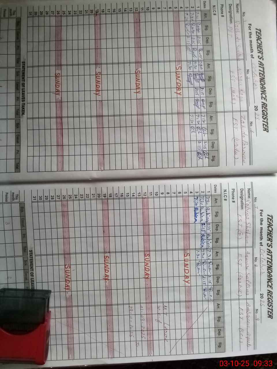 | CNIC | Full Name | Designation | R/C | Absence During Last Calender Month |