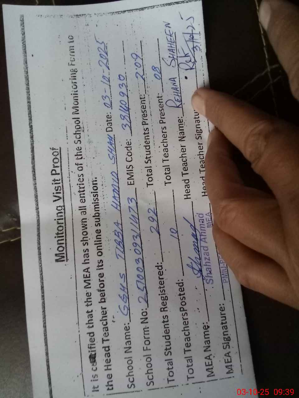 | Monitoring Date: 03-10-2025 | Start Time: 03-10-2025 08:58 AM | End Time: 03-10-2025 09:39 AM | Name of MEA: SH**** AH**** | |