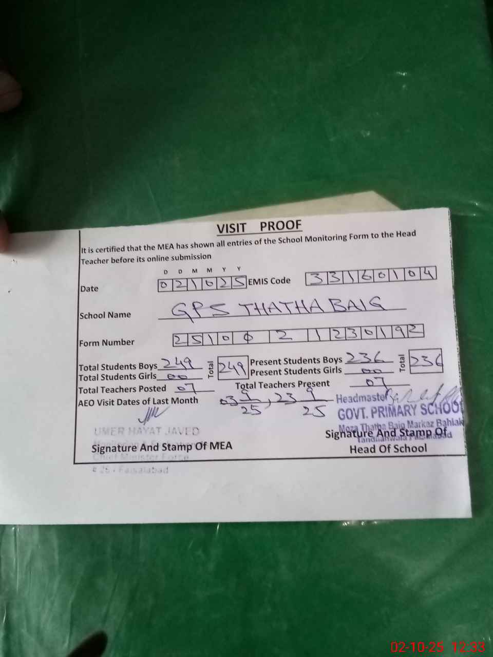 | EMIS Code: 33160104 | Name of School: GPS THATHA BAIG | |||