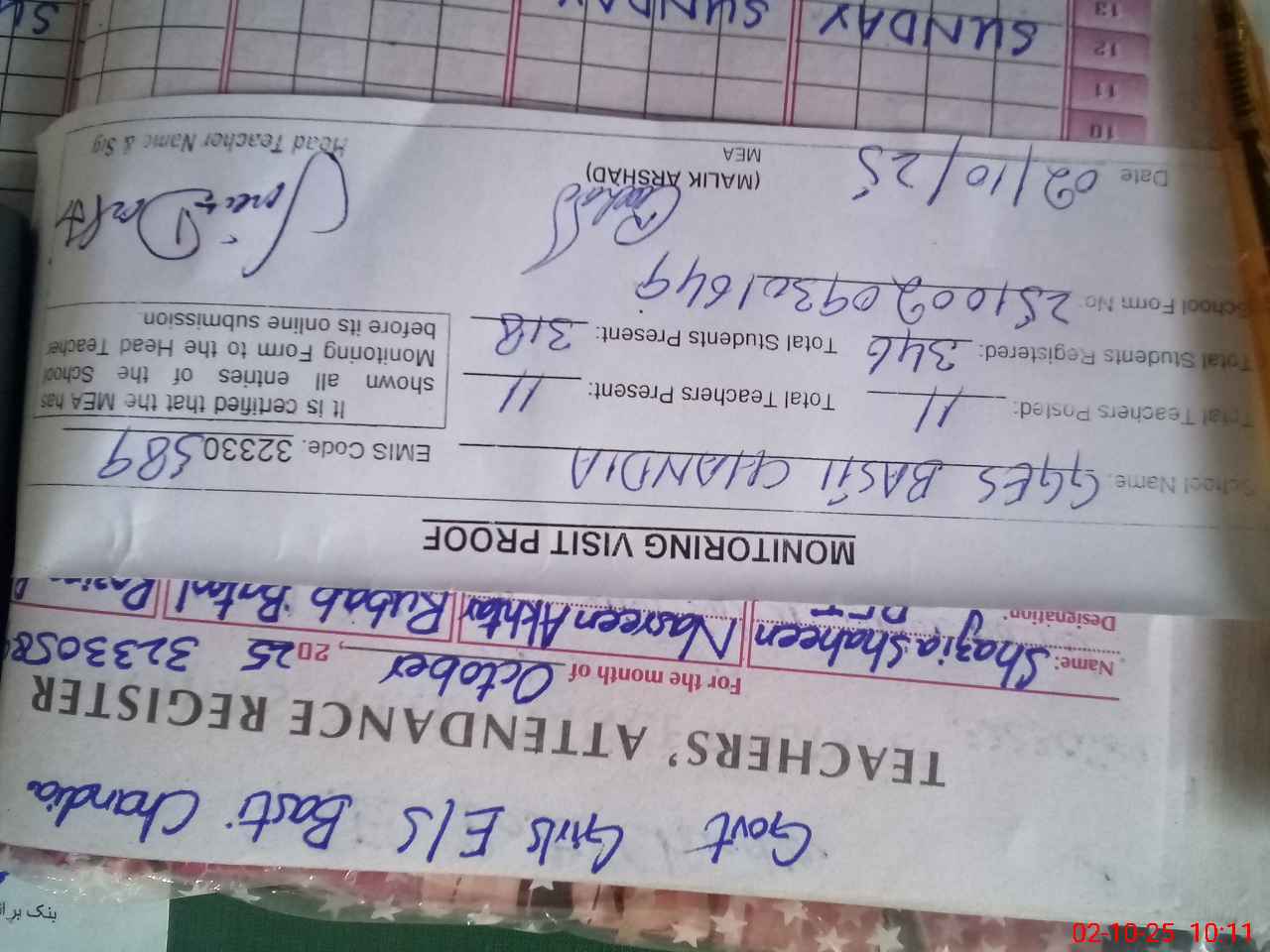 | Attendance Register | Head Teacher | MEA with School | Visit Proof |